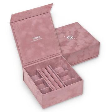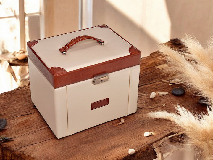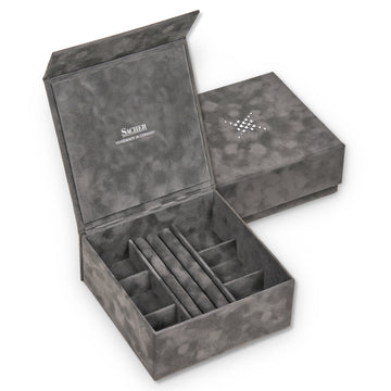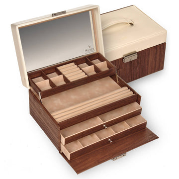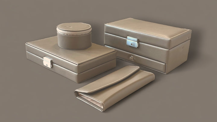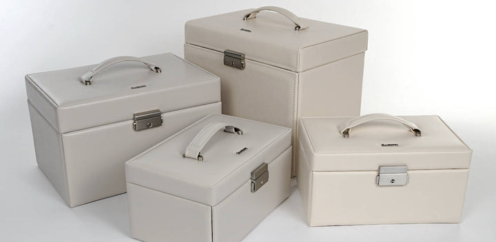 Die Schmuckkästen sind in den eleganten Farben Sand und Elfenbein erhältlich und ihr Interior ist farblich passend abgestimmt. Dies verleiht den Kästchen zeitlose Eleganz.