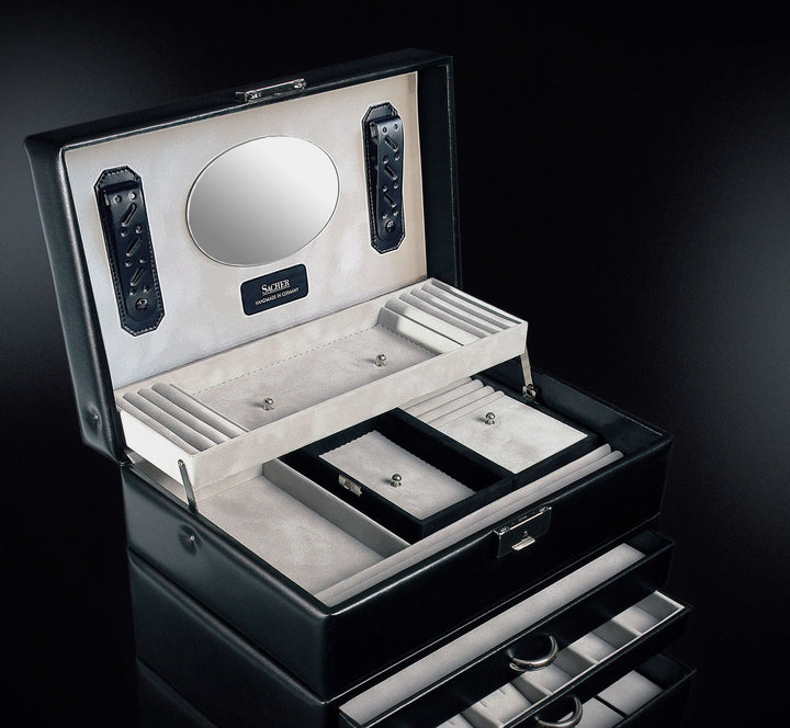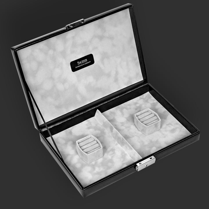 Individueller Schmuck verdient eine ebenso individuelle Aufbewahrung. Entdecken Sie den VARIO Koffer – Ihre maßgeschneiderte Lösung für anspruchsvollen Schmuck. Bei uns haben Sie die Freiheit, Schubfächer nach Ihren spezifischen Bedürfnissen auszuwählen. Ob für opulente Ketten, filigrane Ringe oder extravagante Ohrringe, gestalten Sie Ihren Schmuckkoffer ganz nach Ihrem Geschmack. Der VARIO Koffer passt sich Ihrem Stil an und bietet Ihren wertvollen Stücken nicht nur Schutz, sondern auch eine stilvolle Präsentation. Wählen Sie jetzt die Schubfächer, die zu Ihrem einzigartigen Schmuck passen, und erleben Sie, wie der VARIO Koffer Ihre Schmuckaufbewahrung revolutioniert! Der VARIO Koffer ist in weißem und schwarzem Leder erhältlich.