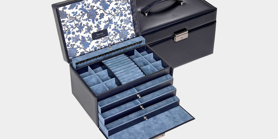 Store your treasures in style: our jewelry case collection in navy blue is the perfect choice for elegance and organization.